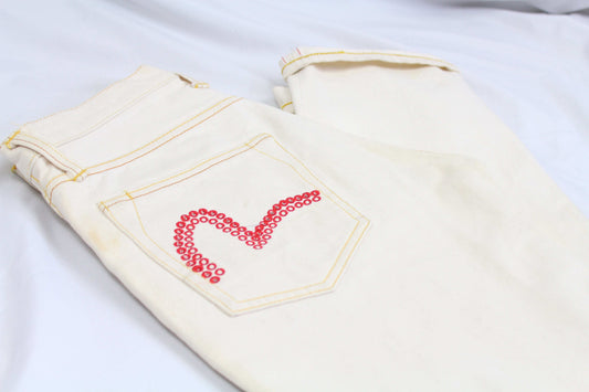 Evisu ist nicht nur für seinen Style, sondern auch für seine kompromisslose Qualität bekannt. Die Marke verwendet ausschließlich hochwertigen japanischen Selvedge-Denim, der für seine Langlebigkeit und den perfekten Fit gefeiert wird. Dieser Denim wird in traditionellen Webverfahren hergestellt, was ihm diese unverwechselbare Struktur und Robustheit verleiht. Die Verarbeitung? Immer on point! Jede Naht, jeder Knopf und jedes Detail wird mit größter Sorgfalt gefertigt. Ob der handbemalte Seagull-Print oder die luxuriösen Stoffe – Evisu steht für Handwerkskunst auf höchstem Niveau. Wenn du eine Evisu trägst, weißt du, dass du nicht nur gut aussiehst, sondern auch etwas trägst, das ewig hält.